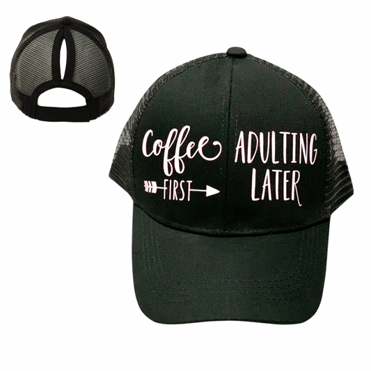 COFFEE ☕️ FIRST ADULTING LATER Ponytail Cap